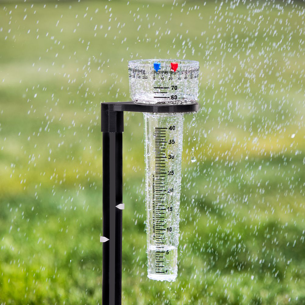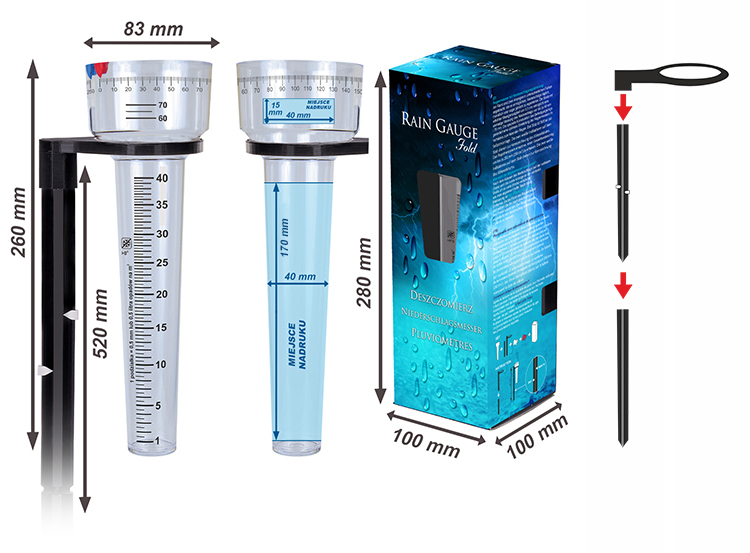 Kielich deszczomierza wykonany z przeźroczystego i bezbarwnego polistyrenu z nadrukowaną pionową podziałką do 70 mm/m2 z dokładnością pomiaru opadu do 0,5 mm/m2 oraz poziomą skalą do indywidualnego sumowania opadów do 250 mm/m2. Dwa różnokolorowe wskaźniki pozwalają na sumowanie opadów wg potrzeb, np. tygodniowy i miesięczny. Stożkowa konstrukcja kielicha i jego ruchome zawieszenie w pierścieniu mocującym to gwarancja optymalnego ustawienia deszczomierza względem padającego deszczu i poprawny pomiar. Możliwość wykonania nadruku reklamowego w kilku miejscach deszczomierza. Innowacyjny składany plastikowy kij jest wyposażony dodatkowo w kolejne dwa sumatory do zaznaczania dni i miesięcy, czyli daty pomiaru.