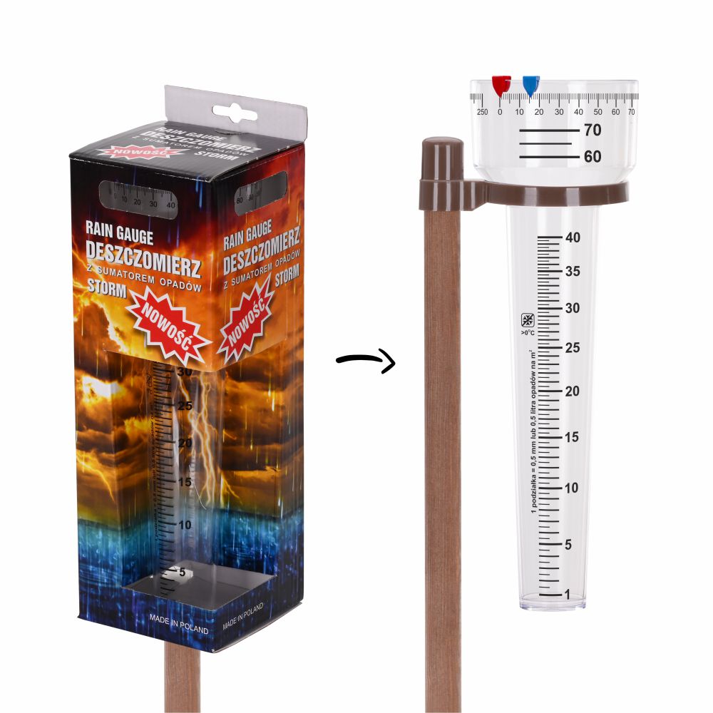 Deszczomierz wraz z sumatorami, uchwytem i kijem z tworzywa sztucznego pakowany jest w elegancki i specjalnie do tego zaprojektowany karton ułatwiający dystrybucję i magazynowanie. Idealnie nadaje się do pomiaru normalnych i intensywnych hydrometeorów.