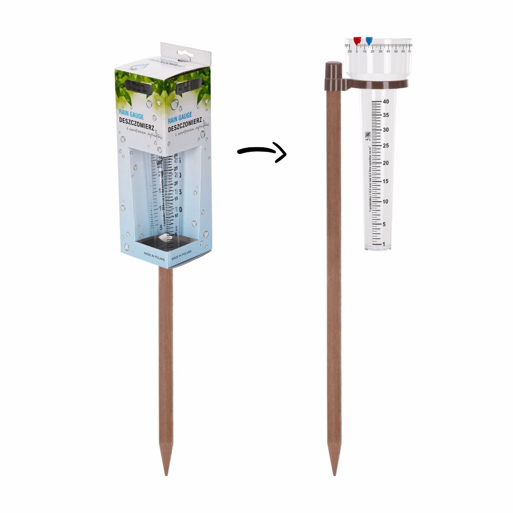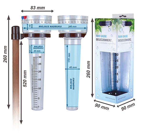 Deszczomierz wraz z sumatorami, uchwytem i drewnianym kijem pakowany jest w elegancki i specjalnie do tego zaprojektowany karton. Zestaw ten to komplet gotowy do natychmiastowego użycia.