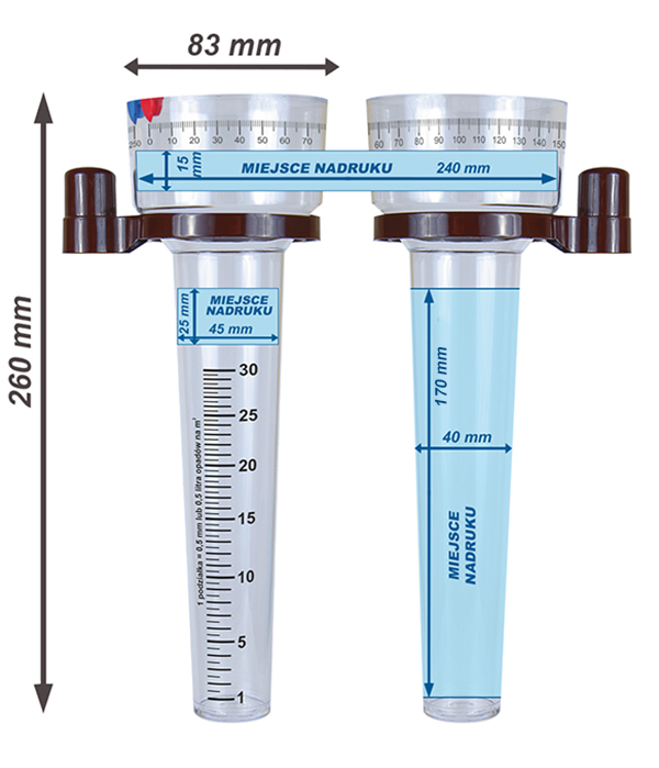 Deszczomierz z dowolnym nadrukiem to doskonały i praktyczny gadżet rolniczy. To urządzenie pomiarowe hydrometeorów pozwalający na ich codzienny monitoring. Idealny prezent promocyjny dla rolnika o wzorcowej jakości i bezkonkurencyjnej funkcji urządzenia. Nadruk logo na deszczomierzu to dodatkowe wzmocnienie wartości produktu o funkcję promocyjną. Górna część miernika opadu jest zarezerwowana na reklamę firmy rolniczej lub chemicznej, banku lub agencji ubezpieczeniowej obsługującej rolników.