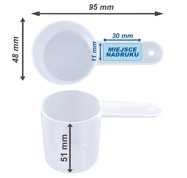 Nasze techniki znakowania pozwalają na personalizację miarko-łyżeczki poprzez nadrukowanie indywidualnego logo lub informacji klienta na plastikowej rączce w wyznaczonym obszarze, jak również na płaszczyźnie pionowej podziałki pomiarowej, zgodnie z życzeniami klienta. Dzięki temu, Twój produkt stanie się nie tylko funkcjonalny, ale także doskonale dopasowany do potrzeb i wymagań Twojej firmy.
