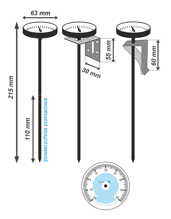 Termometr wykonany ze stali nierdzewnej służy do pomiaru: temperatury gleby przed wysiewem nasion wrażliwych na temperaturę np.: kukurydzy, buraków, temperatury powietrza w każdym pomieszczeniu lub temperatury płynów. Standardowy zakres temperatur to od -20°C do +60°C. Termometr jest wykonany w klasie 1,6 czyli gwarantuje pomiar z dokładnością ± 1°C. Urządzenie mierzy temperaturę za pomocą bimetalu. Iglica zakończona stożkiem ułatwia włożenie termometru do kiszonki lub gleby. Wersja STANDARD oprócz samego narzędzia pomiarowego zawiera dodatkowo uchwyt mocujący do ściany wraz z taśmą montażową lub klips do zamontowania na wiadrze.