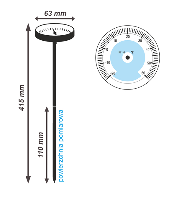 Termometr wykonany ze stali nierdzewnej służy do pomiaru: temperatury kiszonki dla bydła, temperatury gleby przed wysiewem nasion wrażliwych na temperaturę np.: kukurydzy, buraków, temperatury powietrza w każdym pomieszczeniu lub temperatury płynów. Standardowy zakres temperatur to od -20°C do +60°C. Termometr jest wykonany w klasie 1,6 czyli gwarantuje pomiar z dokładnością ± 1°C. Urządzenie mierzy temperaturę za pomocą bimetalu. Iglica zakończona stożkiem ułatwia włożenie termometru do kiszonki lub gleby.
