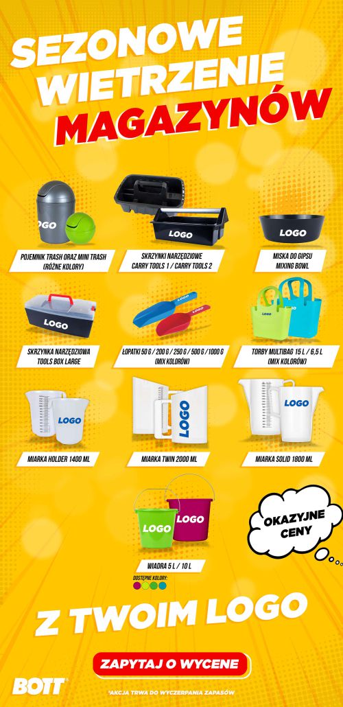 Sezonowe wietrzenie magazynów już się zaczęło!Wybierz spośród naszych wyjątkowych produktów w niesamowitych cenach. Posiadamy szeroki wybór, w tym miarki Twin i Solid 1800 ml, łopatki, skrzynki narzędziowe, torby Multibag, wiadra 5l oraz wiadra 10l. To idealna okazja, aby zaopatrzyć się w niezbędne artykuły gospodarstwa domowego oraz narzędzia. A co więcej, istnieje możliwość nadrukowania Twojego logo na wybranych produktach, dodając im personalizacji i unikalnego charakteru. Zainteresowany? Zapytaj naszego sprzedawcę o wycenę i skorzystaj z naszych niezwykłych ofert już dziś!